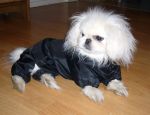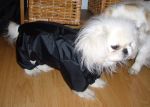 Nyt kun pekestä on kysymys, niin kannattaa harkita suojapukua, niin ei tarvitse joka ulkoilutuksen jälkeen vettä käyttää. Silloin koira pitäisi aina kuivata huolellisesti, mielellään hiustenkuivaajalla, ettei jää kosteaksi eikä iho ala hautumaan ja puhkea ihottumaa. Suomen Pekingesikerhon tarvikemyynnissä on myynnissä kevyitä suojapukuja, jotka ehkäisevät tuon roskien tarttumisen ja kura ja lika jäävät siihen pukuun myös, vaikka ei vedenkestävä olekaan. Tietty nyt koira on kasvavassa iässä, joka ikään ei varmaan pukua kannata hommata vaan vaikka vähän kasvunvaraa nyt nuorelle iälle ja sitten kiertoon jollekin koirakaverille ja sitten seuraava puku kun on täysikasvuinen. Peken ruumiinmalli on sellainen, ettei moet markkinoilla olevat valmiit puvut sille sovi.